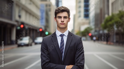 Urban Professional: A Young Man in a Business Suit with Arms Crossed Standing on the Street, generative AI