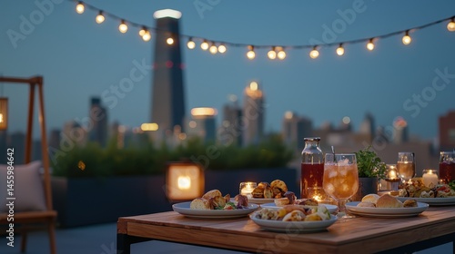 Urban Rooftop Dinner with String Lights Creating a Cozy Evening Atmosphere in the City