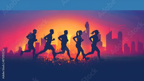 Urban Runners Race Against Vibrant Sunset Skyline