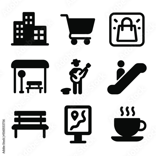 Urban Shopping Icons. Solid, filled icon set of Urban shopping experience: city buildings, shopping cart, neon sign, bus stop,