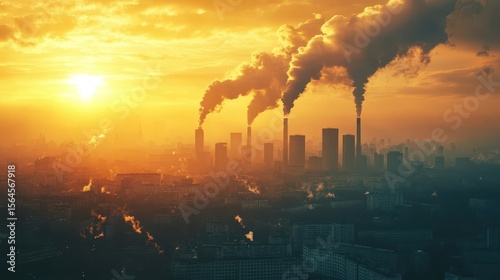 Urban skyline view with smog rising from industrial stacks at sunrise. Use this for environmental or business concepts involving pollution.