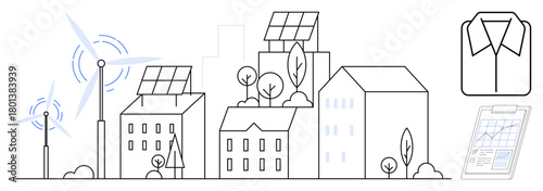 Urban skyline with homes and buildings powered by solar panels and wind turbines. Clipboard with growth chart and shirt icon. Ideal for sustainability, green energy, eco-living, smart cities