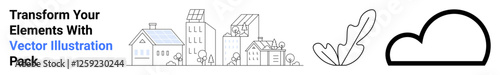 Urban skyline with solar panels, leaf and cloud outline emphasizing sustainability and eco-friendly themes. Ideal for technology, environment, clean energy, urban living, digital services