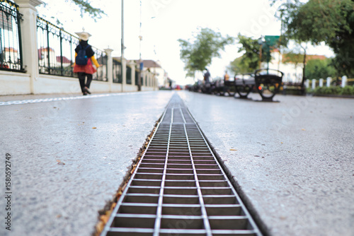 Urban Street with Grated Drain and Pedestrian, Focused on Perspective