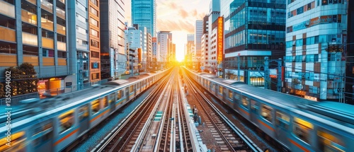 Urban sunset view with train tracks converging in a bustling cityscape surrounded by skyscrapers