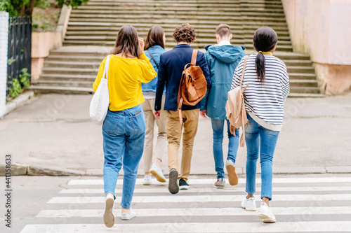 Urban teenage hipster street lifestyle.Rear view of students go to college or high school to study. Crosswalk traffic laws concept.