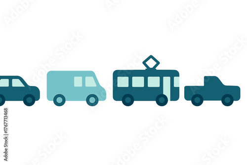Urban transportation vehicles set including sedan, van, tram, and pickup truck