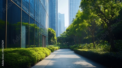 urban walkway flanked by tall glassfronted buildings on one side and lush green shrubs on the other : Generative AI