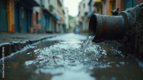 Urban water flow: street scene with flowing water from pipe in vibrant city