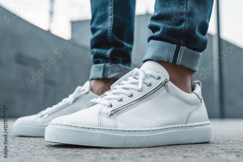 Urban white sneakers on feet, concrete steps background