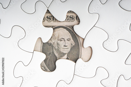 US Dollar banknotes on white jigsaw puzzle. Business and copy space concept