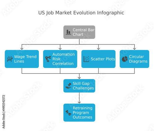 US Job Market Evolution Infographic: Visualizing data on wage trends, automation risks, and skill gaps