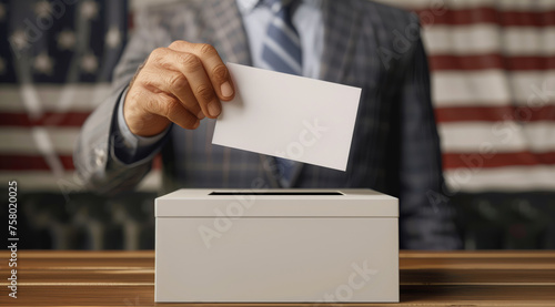 US presidential election 2024, a man in a suit puts a ticket in a basket against the background of the American flag
