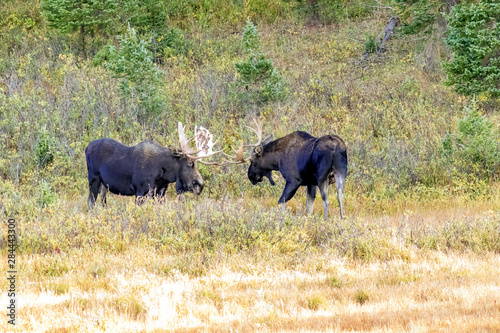 USA, Colorado, Cameron Pass. Two bull moose dueling.