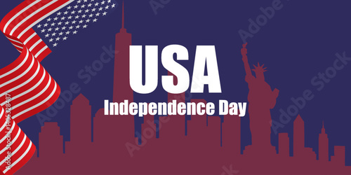 USA independence day, waving US flag ribbon and American City skyline including statue of liberty on background. Patriotic design for American Independence Day celebration.
