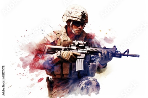 USA military force soldier in camouflage uniform and helmet with a weapon with the national flag behind. Generative AI