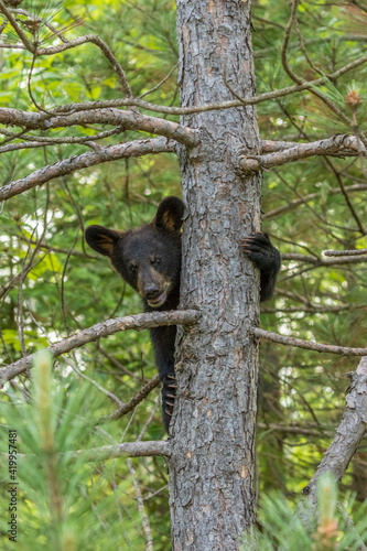 USA, Minnesota, Minnesota Wildlife Connection. Captive black bear cub climbing tree.