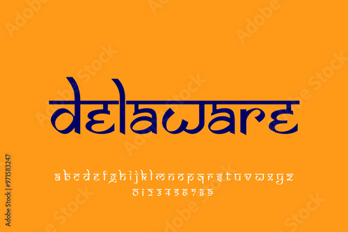 USA state Delaware text design. Indian style Latin font design, Devanagari inspired alphabet, letters and numbers, illustration., Hindi fonts