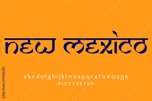 USA state New Mexico text design. Indian style Latin font design, Devanagari inspired alphabet, letters and numbers, illustration.