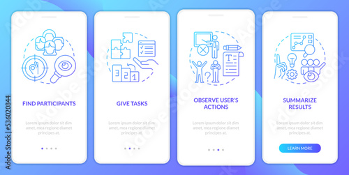 Usability testing session plan blue gradient onboarding mobile app screen. Walkthrough 4 steps graphic instructions with linear concepts. UI, UX, GUI template. Myriad Pro-Bold, Regular fonts used