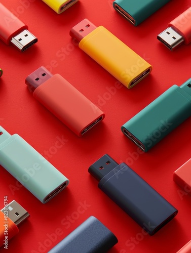 USB flash drives of assorted colors scattered on an isolated crimson background