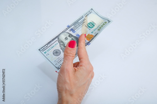 Usd banknote view in female hand on white background.