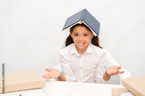 Use break to relax. Girl child hold mug while sit table white interior. Schoolgirl relaxing on break and drinking tea. Kid school uniform dreamy face hold cup. Rest important part educational process