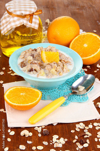 Useful oatmeal in bowl with fruit on wooden table close-up