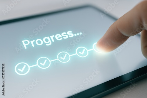User Engaging with Touchscreen Device to Indicate Progress in Digital Interface with Checkmarks