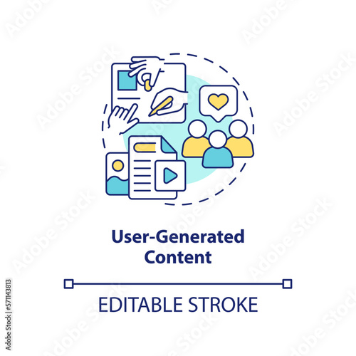 User generated content concept icon. Ads creative. Social media advertising tip abstract idea thin line illustration. Isolated outline drawing. Editable stroke. Arial, Myriad Pro-Bold fonts used