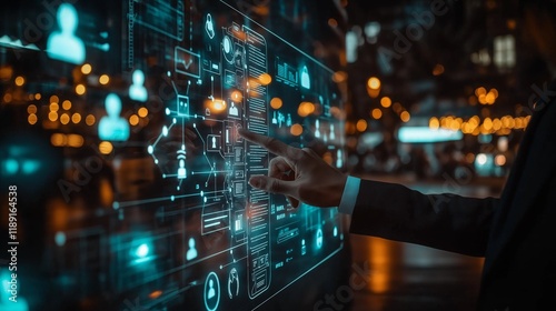 User Interacting with a Futuristic Digital Display, Showcasing AI, Cybersecurity, and Smart Automation in an Advanced Business Environment, Generative AI
