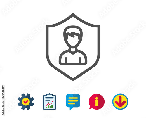 User Protection line icon. Profile Avatar with shield sign. Male Person silhouette symbol. Report, Service and Information line signs. Download, Speech bubble icons. Editable stroke. Vector