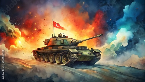 Using a street tank, this watercolor picture honors Turkey's National Unity Day and Democracy.