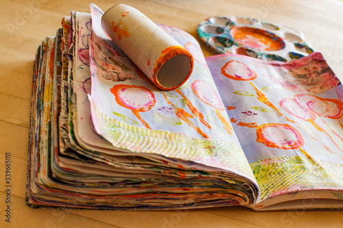 Using a toilet paper roll to paint with in an art journal and a palette on a wood table