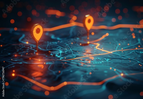 Using AI technology, digitally set two pins on a map to mark new office location and route path, highlighting innovation in GPS and future transport logistics.