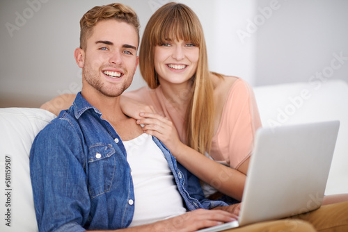 Using their laptop from the comfort of the couch. A young couple using a laptop while relaxing on the couch.