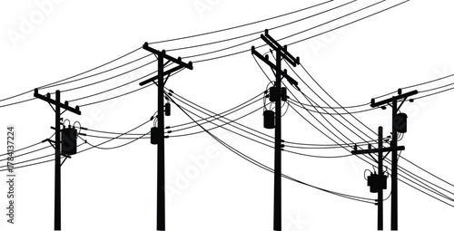 Utility poles with transformers and interconnected power lines, electrical distribution vector illustration,