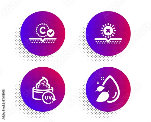 Uv protection, No sun and Collagen skin icons simple set. Halftone dots button. Water drop sign. Skin cream, Uv protect, Serum oil. Beauty set. Classic flat uv protection icon. Vector