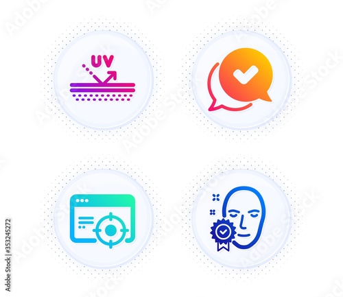 Uv protection, Seo targeting and Approved icons simple set. Button with halftone dots. Face verified sign. Skin cream, Performance, Chat message. Access granted. Business set. Vector