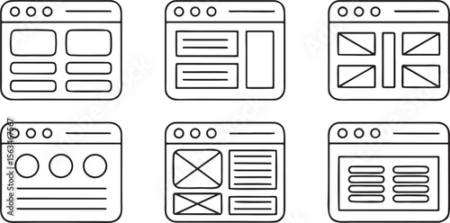 UX UI Wireframe Icon Set, layout grid, button, dropdown, sidebar, navigation bar, input field, editable web and app interface components