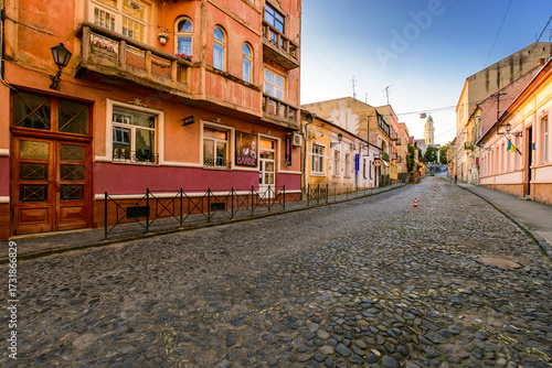 uzhhorod, ukraine - 11 jun, 2017: narrow street of old town leads to square in empty historic center at sunrise. beautiful architecture of uzhhorod in morning light under blue sky. scenic downtown