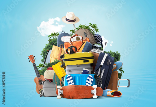 Vacation and travel concept with a suitcases and other accessories. Time to travel