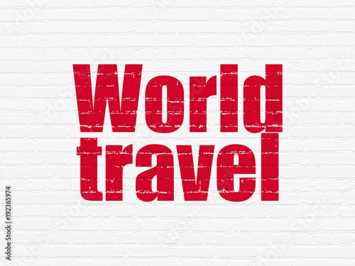 Vacation concept: Painted red text World Travel on White Brick wall background