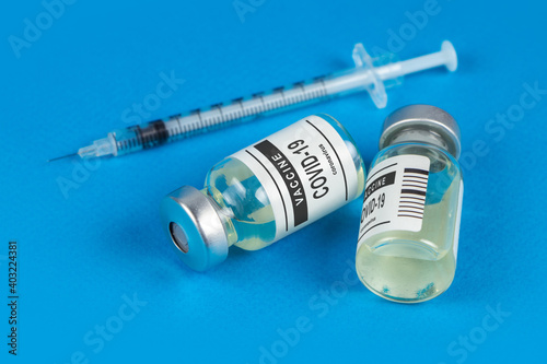 Vaccination. Syringe and vaccine COVID-19. Coronavirus on blue background