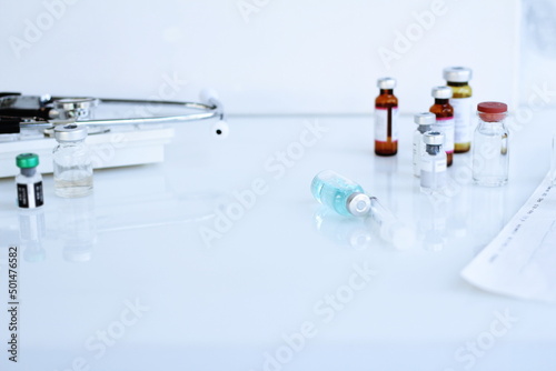 Vaccine bottle and syringe placed on a white table. Healthcare and medical concept.