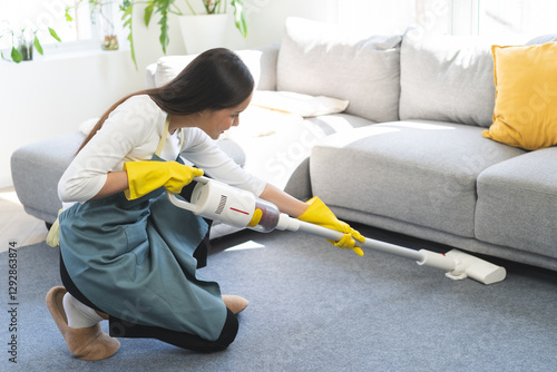 Vacuuming cleaning, housekeeping asian young woman, girl cleanup with portable cordless vacuum cleaner to clean floor on rug in living room at home, house. Housework or household and chores concept.