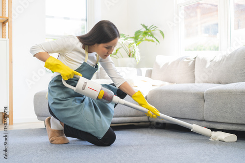 Vacuuming cleaning, housekeeping asian young woman, girl cleanup with portable cordless vacuum cleaner to clean floor on rug in living room at home, house. Housework or household and chores concept.