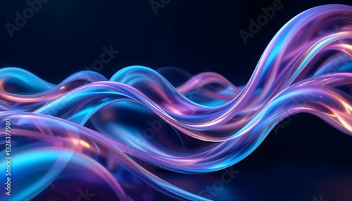 Vagues fluides holographiques néon en mouvement avec formes cylindriques sur fond sombre. Rendu 3D futuriste.