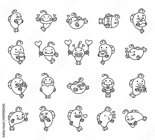 Valentine anglerfish character set showing romantic emotions with hearts, kisses, balloons, cards, gifts, flowers, cake and cheerful smiling faces for yours designs projects