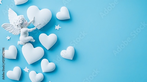 Valentine Day concept: white hearts and Cupid aiming at a heart on a blue background Valentine's Day cards flat lay